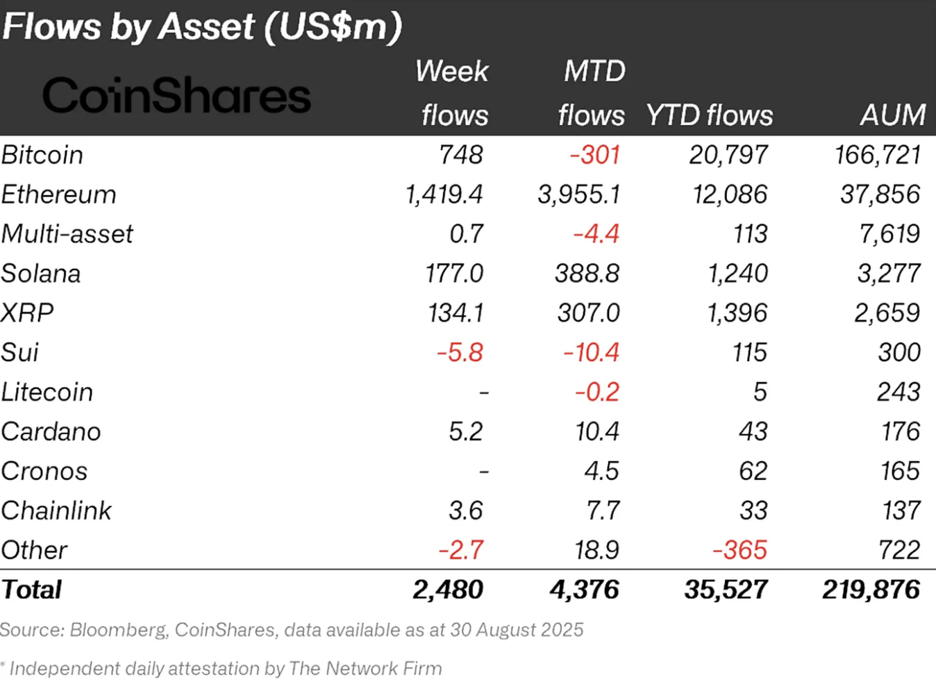 Looking at crypto money basis Ethereum $4,434.37 He was the winner of the week with an entry of 1.4 billion dollars. Bitcoin $109,062.22 748 million dollars in the second place remained in the second place. However, with a wider perspective, a total of $ 3.95 billion entry into Ethereum in August was $ 301 million out of Bitcoin.