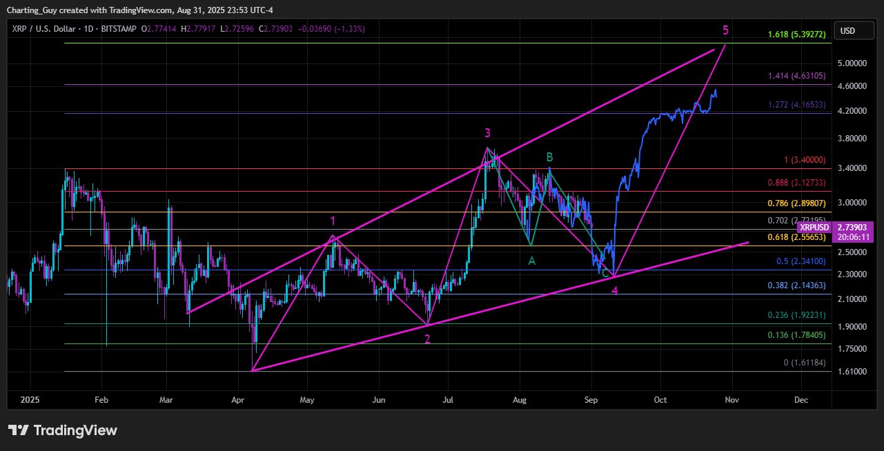 XRP price On the way back to the beginning of August, he sat on the support line of $ 2,70–2.75. This region corresponds to the 0.618 Fibonacci correction level of the latest rally. Crypto currency analyst Charting guythe price has been traded on the lower band of the rising channel that has been preserved for a long time. According to the analyst, the current price movement can be considered as the fourth wave according to Elliott Wave Theory. The targets for the fifth wave rise stand out as 4,16, 4.63 and $ 5.39.