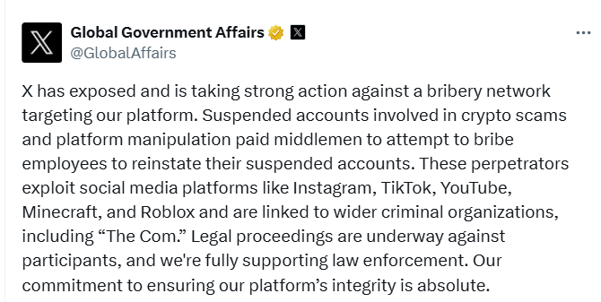 “X has revealed a bribery network targeting our platform and takes harsh measures against this network. Suspended accounts involved in crypto fraud and platform manipulation paid to intermediaries to get back to the employees to reclaim suspended accounts.