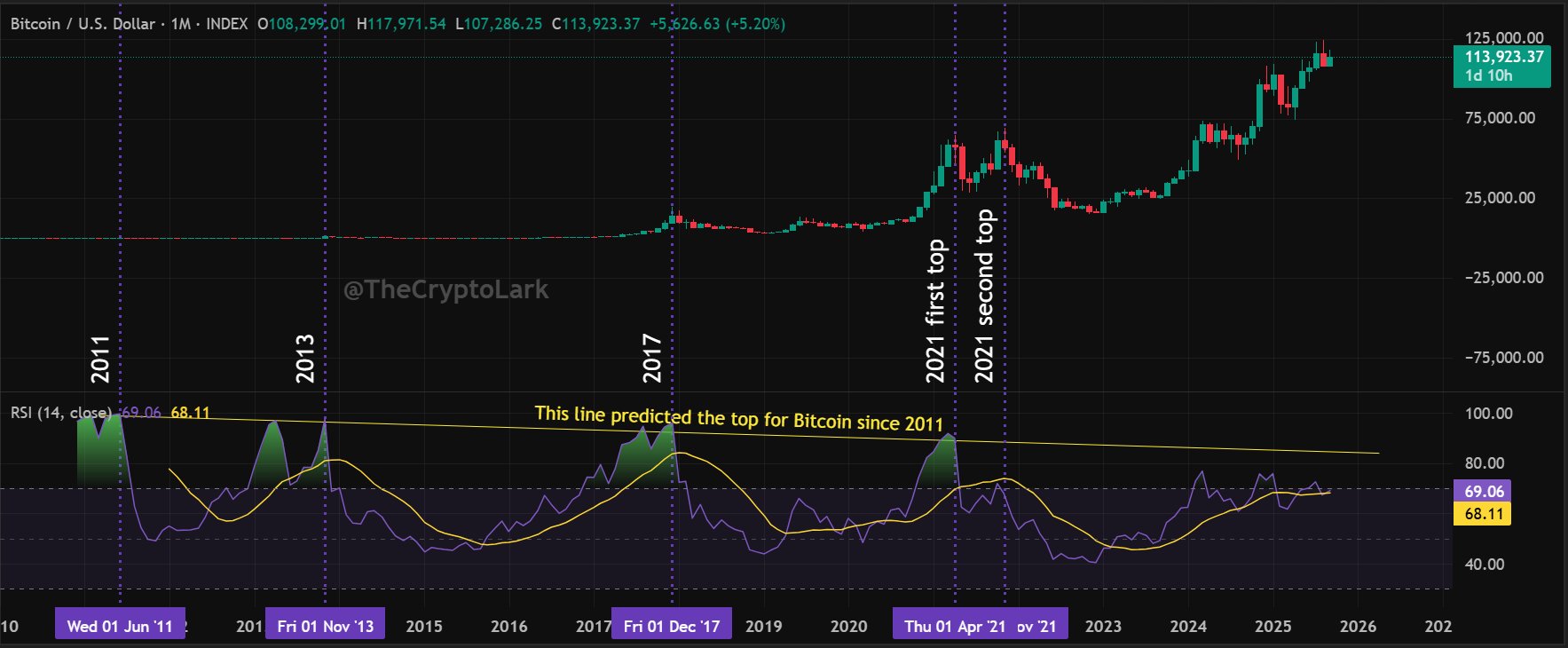 $116,250.69pointing to the summits. The monthly decline curve in the Monthly RSI caught the first summit of 2013, 2017 and even 2021 (some argue that it was the “real” summit).