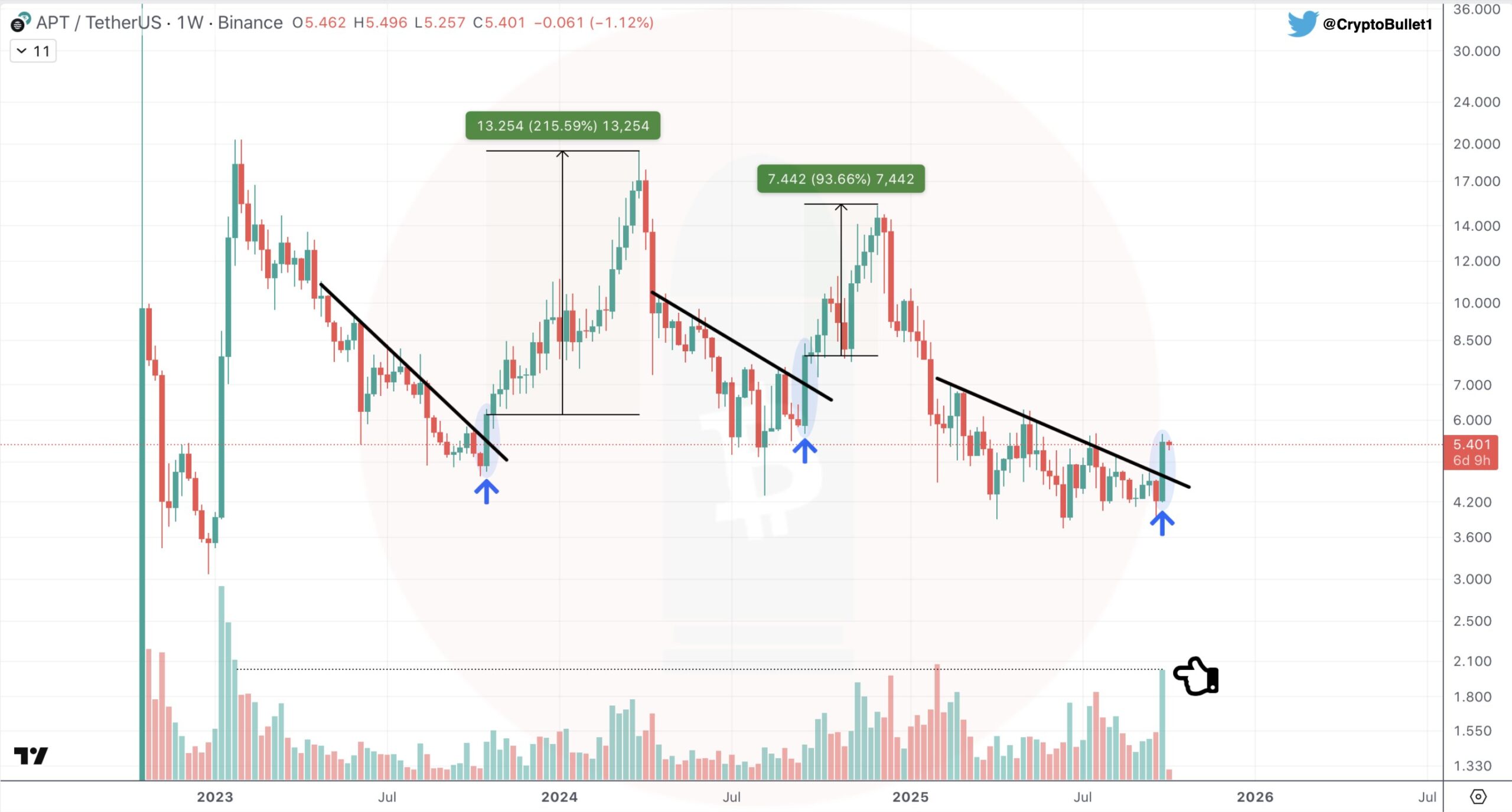 “APT In the weekly graph, a strong breaking created a candlester. The same breakage wax stick was formed in October 2023 (a 215 %medium -term rise) and in September 2024 (then a 93 %medium -term rise).