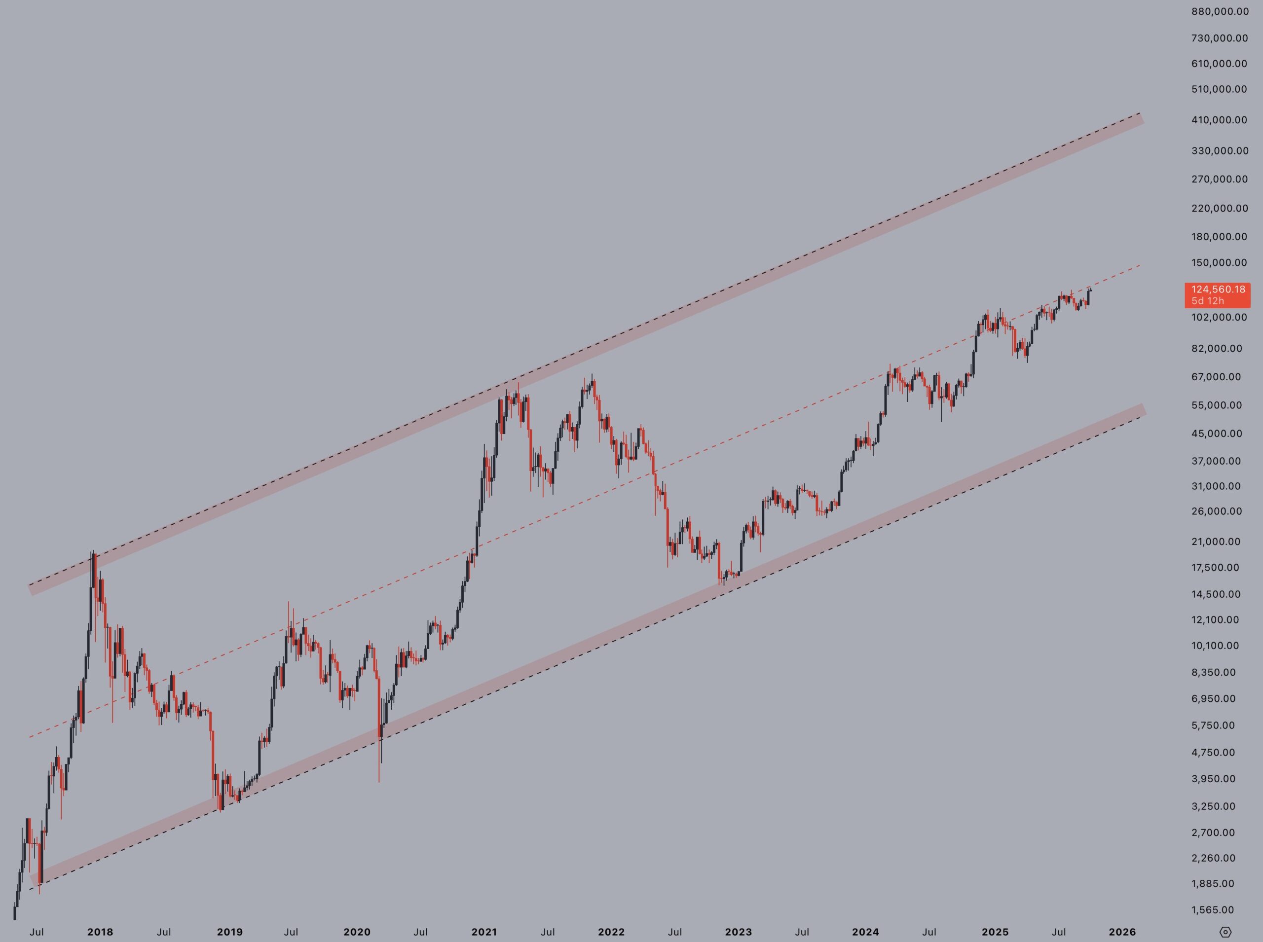 BTC He fell to the bottom of the daily and he finds buyers at 122,800 dollars at the time of the article. Closes below daily support may decrease below 120 thousand dollars. Jelle was more hopeful than BTC, which has reached the midpoint of the rising channel for 8 years.
