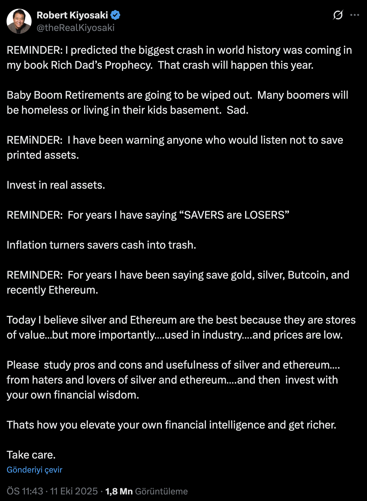 After the sharp sales in cryptocurrencies and stocks Robert Kiyosakiannounced that it expects a more severe collapse within the year. what he did on the weekend X In his post, he suggested that the retirement funds of the Baby Boomer generation could be wiped out. The author, known for “Rich Dad, Poor Dad,” invited investors to turn to “real assets,” particularly with silver. Ethereum
