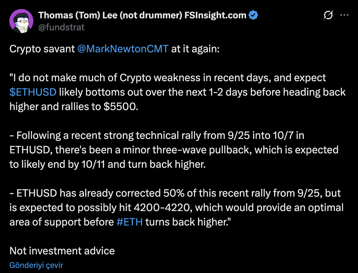 After the sharp decline Ethereum $3,836.17 is on the agenda again with the expectation of an increase. Director of technical strategy at Fundstrat Mark NewtonHe suggested that the search for a short-term bottom in the largest altcoin is nearing completion, after which the price could make a new rise up to $5,500. According to Newton, the downward pressure is now about to fade, and then the trend may turn upward with an acceleration similar to the rally at the end of September. Tom Lee follows the scenario put forward by Newton. X He highlighted it by sharing it on his account.