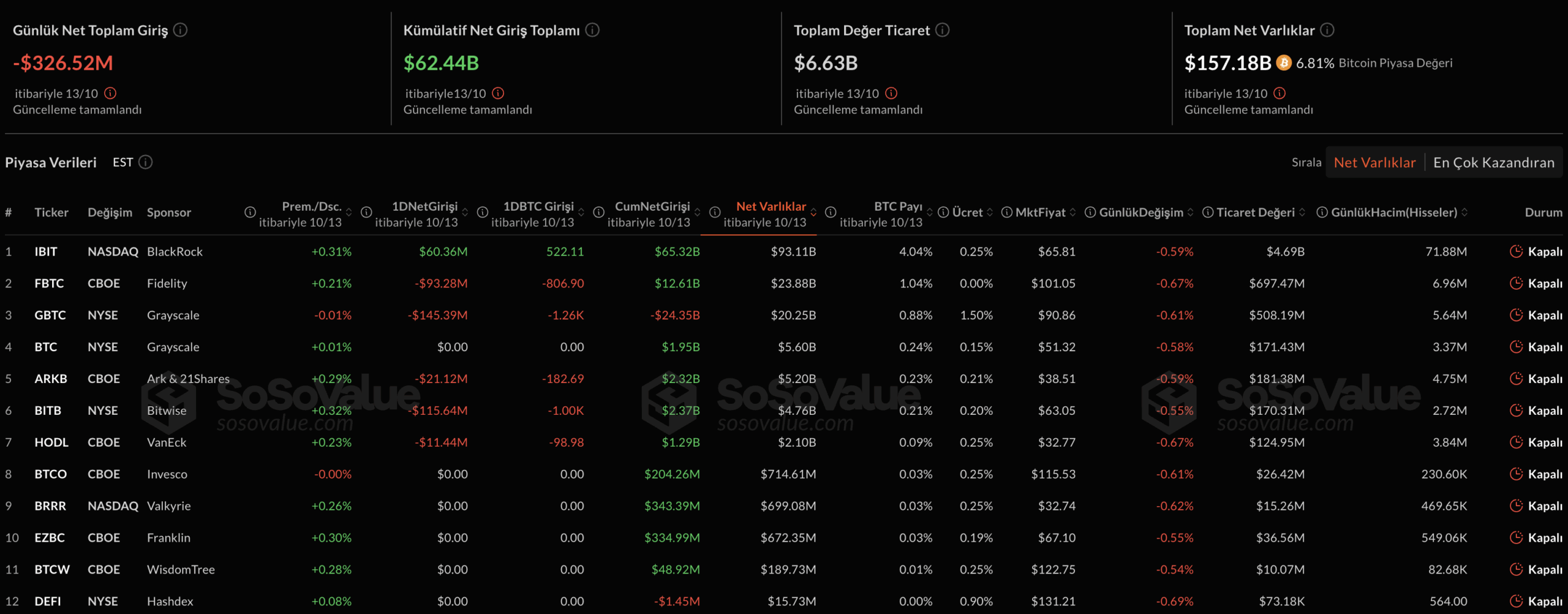 $111,963.18 ETFThere was a net outflow of approximately 327 million dollars on October 13. It was seen that ETFs took profits in the price recovery following the harsh weekend sales. Highest unique entry BlackRock‘s IBIT, while Grayscale’s GBTC led the outflows. Bitcoin continues to seek balance after the historic liquidation shock, with a rise of over $115,000 as of the new week. The direction of the flows indicates that the corporate front reduces risk in the short term and adjusts its position by selling on stronger days.