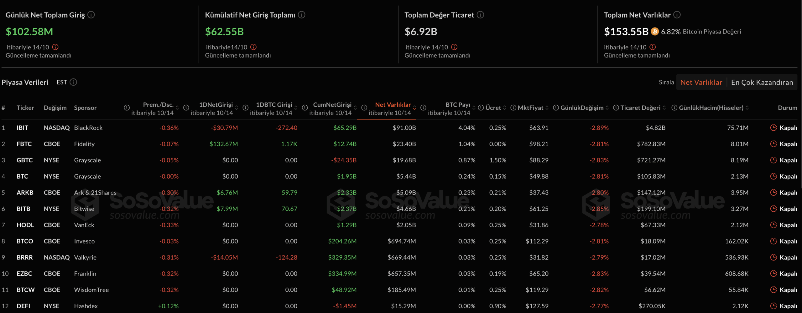 $4,011.20 There was a total net inflow of 340 million dollars to ETFs on October 14, corresponding to the last trading day. The inflow is a partial offset to the $755 million outflow seen on Monday, following historic liquidations over the weekend. SoSoValue data shows that there was a total inflow of $102.6 million on the Bitcoin side, with Fidelity’s FBTC standing out with an inflow of $132.67 million. Ark & 21Shares and Bitwise’s ETFs saw positive fund flows, while BlackRock’s IBIT saw $30.8 million in outflows and Valkyrie’s BRRR saw $14 million in outflows. On the Ethereum side, a total of $236.22 million inflow to six ETFs attracted attention, while Fidelity’s FETH took the lead with $154.62 million.