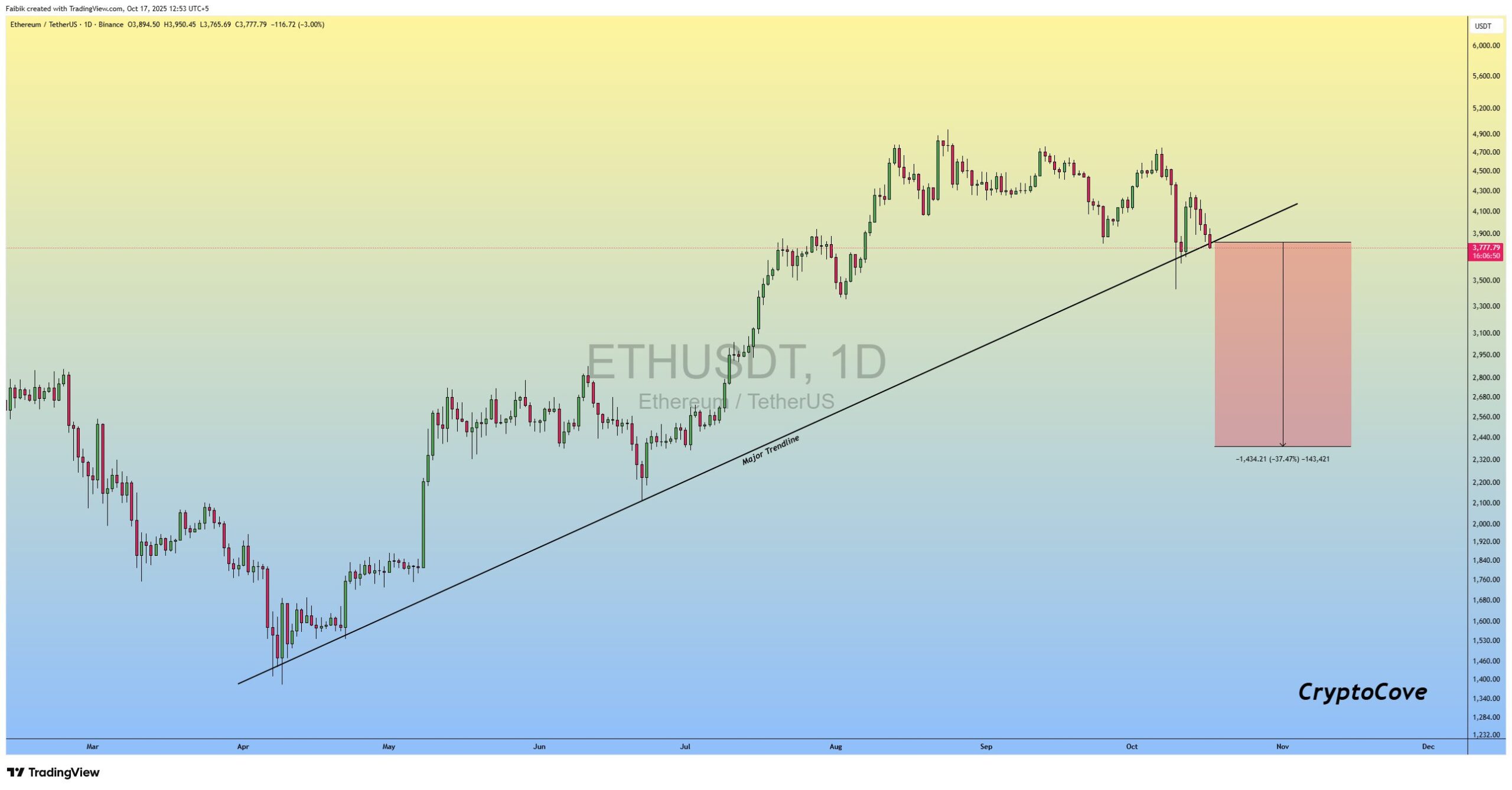 Faibik, for Ethereum, has been protected on the chart for a long time. rising trend lineHe stated that it serves as a critical support. ETH/USDT parity continued the withdrawal it started from the level of $ 4,000 and fell to around $ 3,770. According to the analyst, if this trend line is broken, the price may drop to the $ 2,400 region.