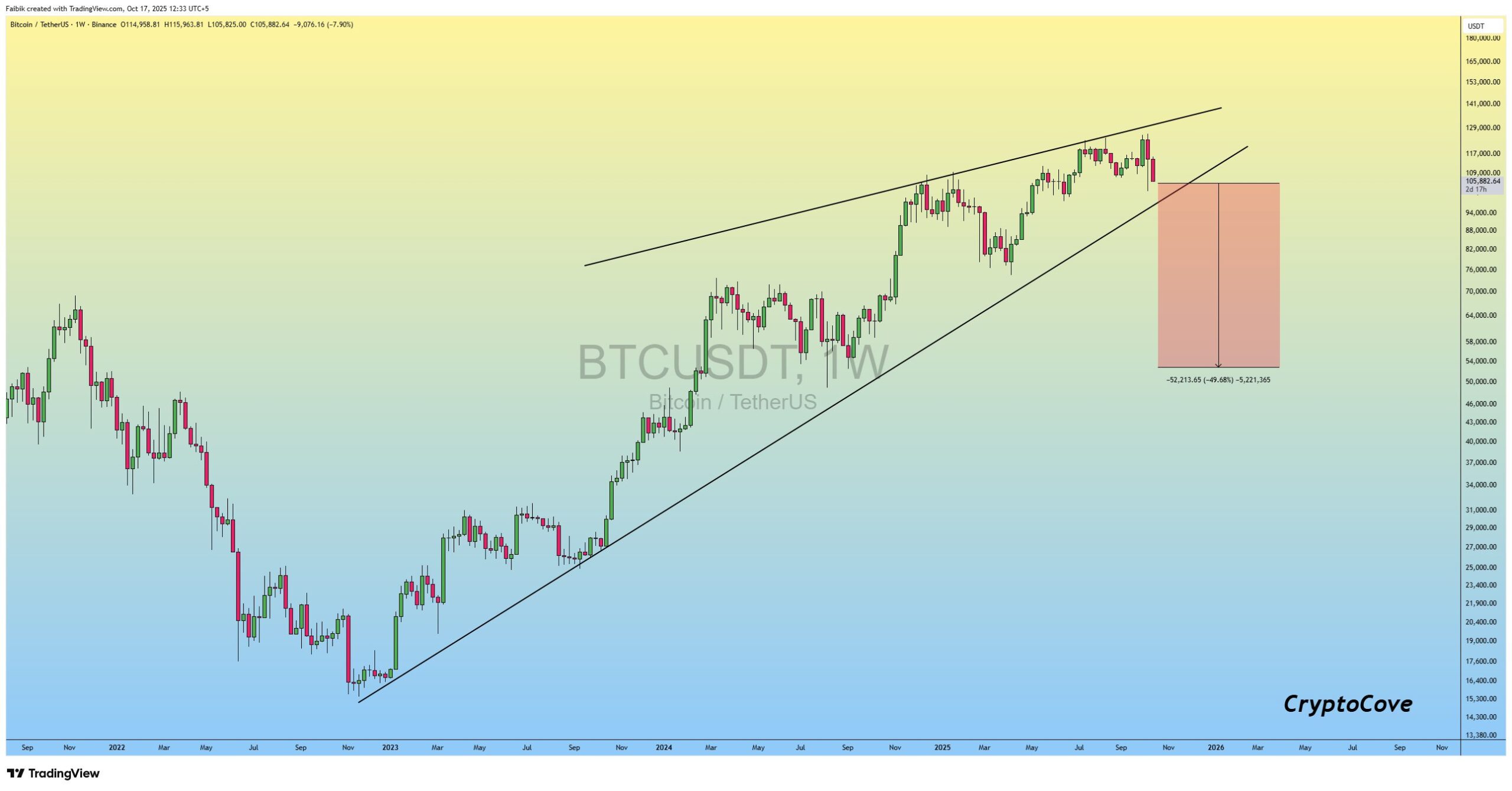 Faibik’s X BTC/USDT weekly chart shared from his account widening wedge formationIt reveals that . The price of Bitcoin retreated sharply from $ 115,000 and fell to the $ 105,000 range. The analyst stated that the formation target could extend up to $ 50,000 and pointed out a correction potential of 49.6 percent in the medium term.