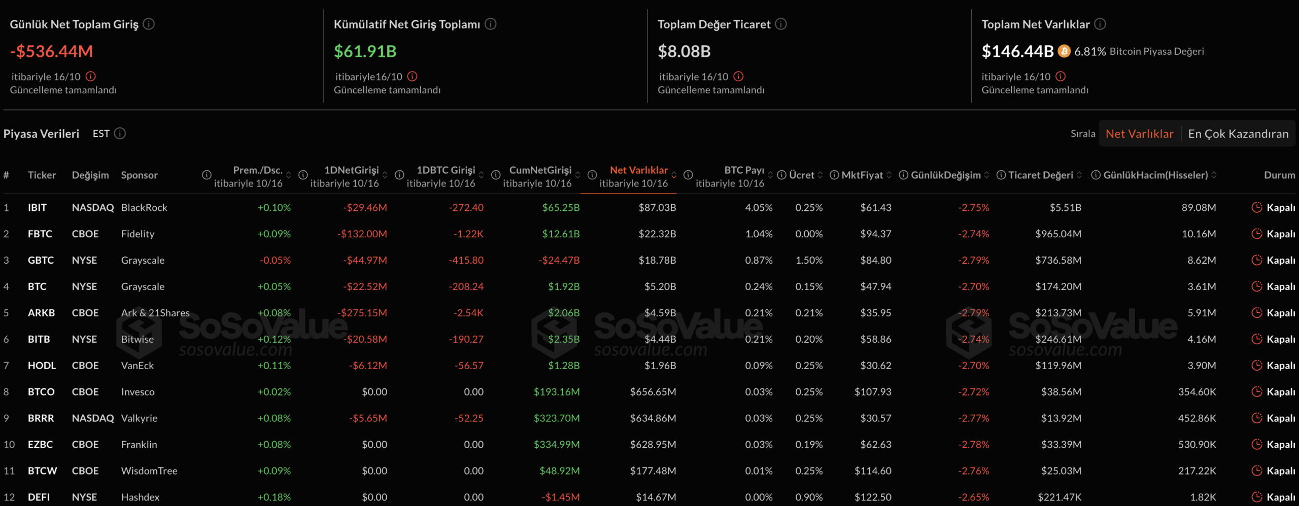 $105,106.73 ETFThere was a total net outflow of 536.4 million dollars on Thursday. SoSoValue According to data, this figure corresponds to the largest single-day outflow recorded since August 1. According to SoSoValue data, there was an investor exit from eight out of 12 Bitcoin ETFs. $275.15 million was withdrawn from Ark & 21Shares’ ARKB and $132 million was withdrawn from Fidelity’s FBTC. ETFs managed by BlackRock, Grayscale, Bitwise, VanEck and Valkyrie also reported negative flows.