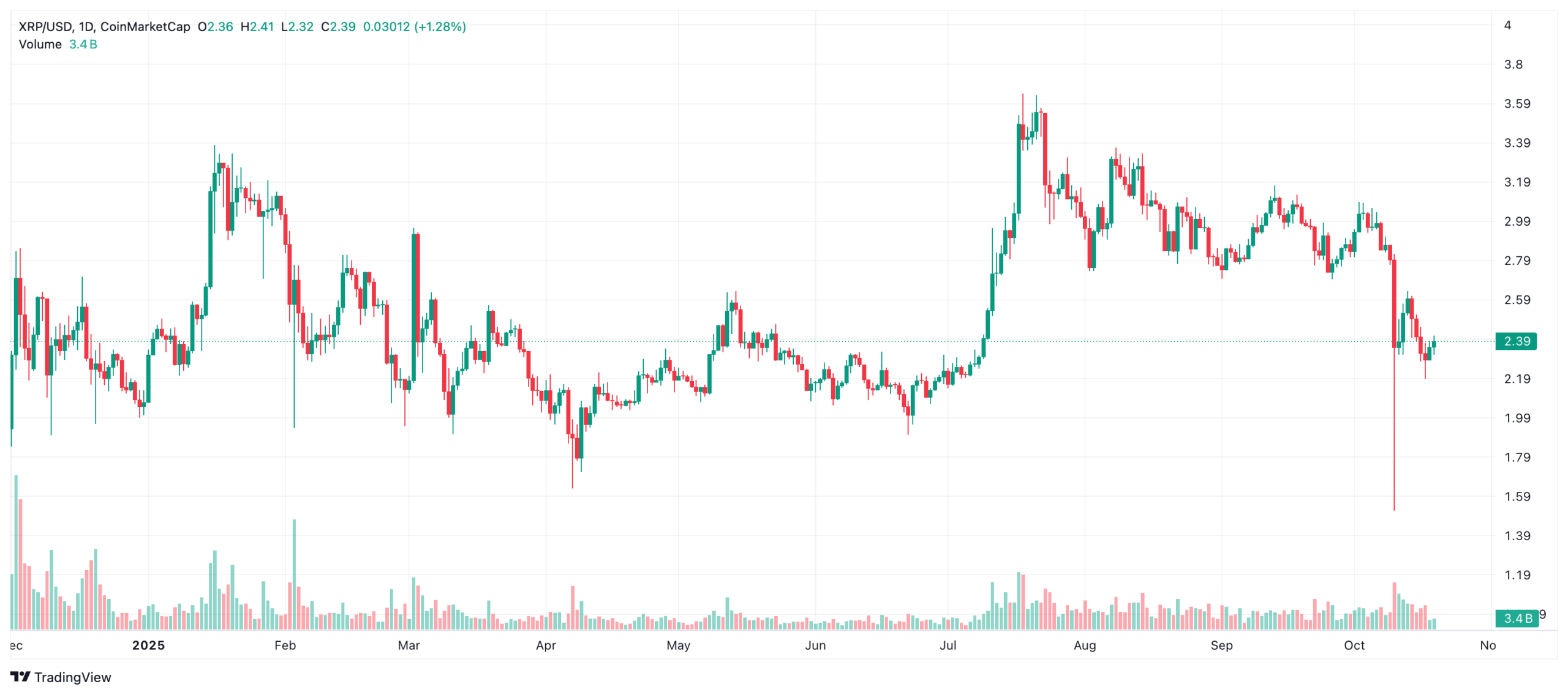 XRP follows a horizontal trend in the range of $ 2.30-2.50 on the first trading day. After the sharp rise on October 18, the volume reached 42 million units, twice the average. However, during the Asia–US transaction transition, liquidity tightened and the price was stuck at $2.35. Analysts state that the volume contraction could be a signal of a pre-breakout squeeze.