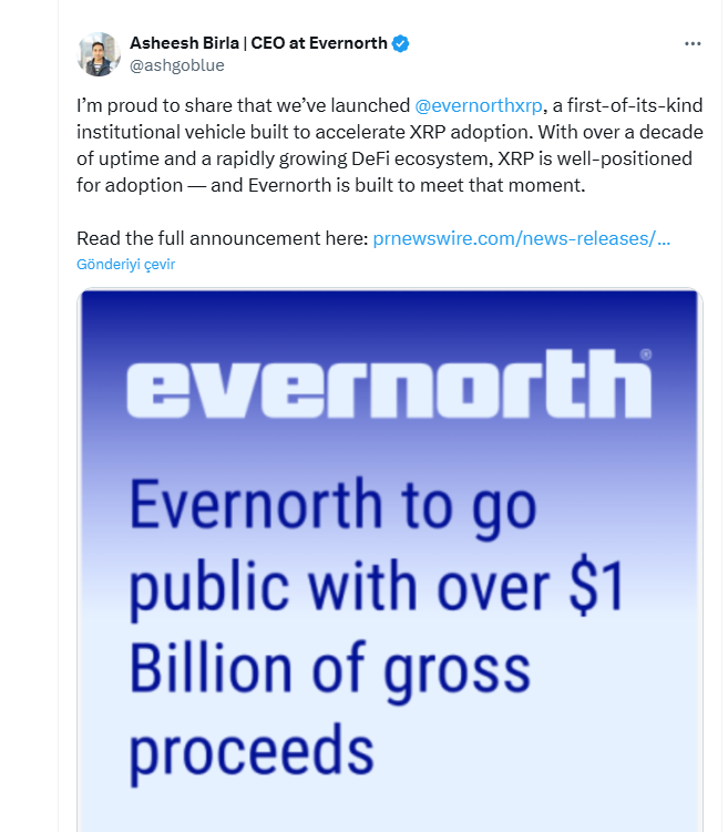 “Asheesh and his team are building something special with @evernorthxrp. We are proud to partner with him and join incredible investors like SBI Holdings, Pantera Capital, Kraken, GSR, and Rippleworks to support Evernorth’s participation in institutional lending, liquidity provision, and DeFi yield opportunities for XRP.”