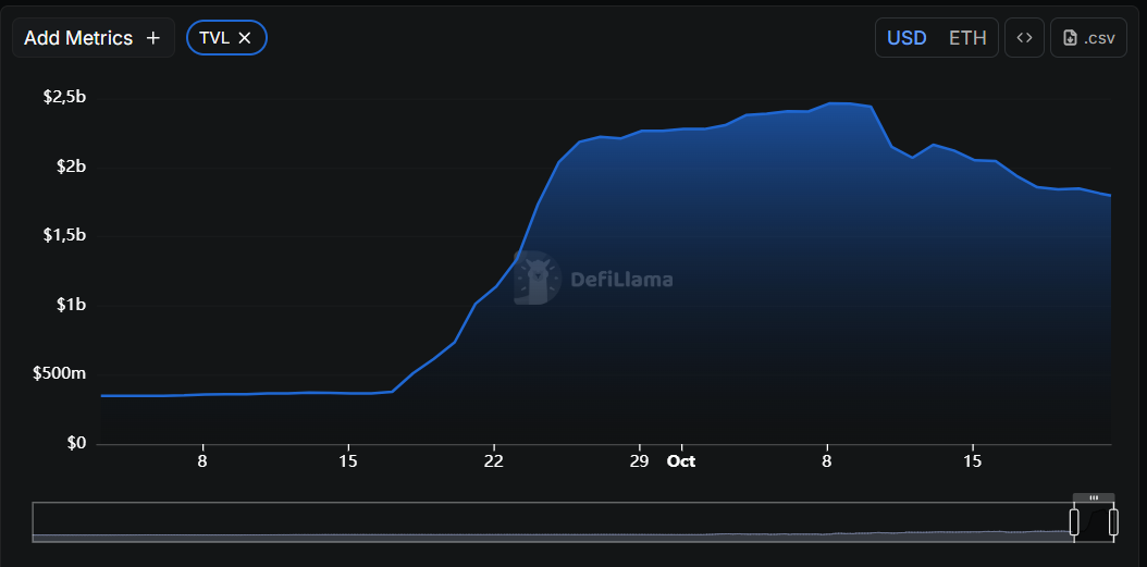Aster had a strong launch on September 17 with the support of CZ, and we saw the total locked value on the network steadily increase. It reached its peak with $2.44 billion on October 10, but the known decline process also prevented its TVL growth. The steady rise has now turned into a steady decline.