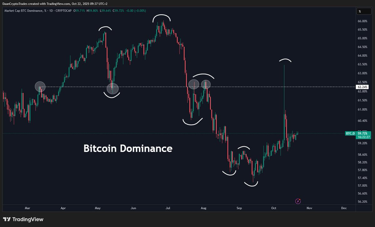 DaanCrypto looks at the BTC market dominance chart, which is the most important indicator for the altcoin bull. The analyst, who expects at least part of the wick to be filled, hopes that BTC will strengthen with the gold rotation.