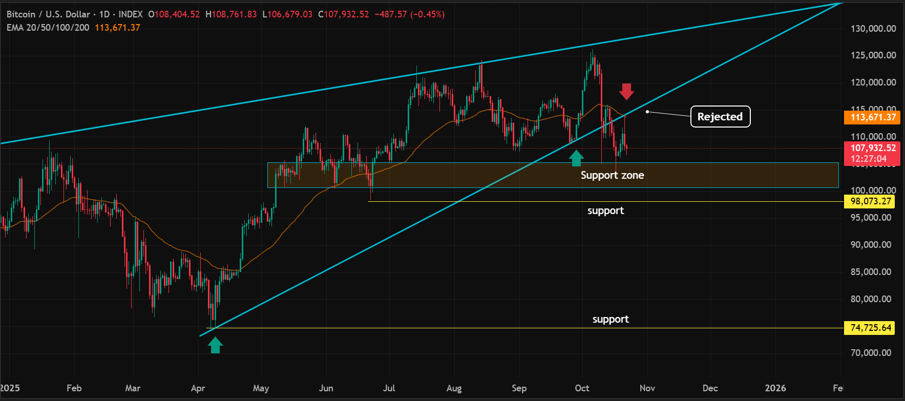 $108,190.87‘of The daily candlestick chart was rejected from the same support level it held in April. “Right now it’s acting as resistance.”