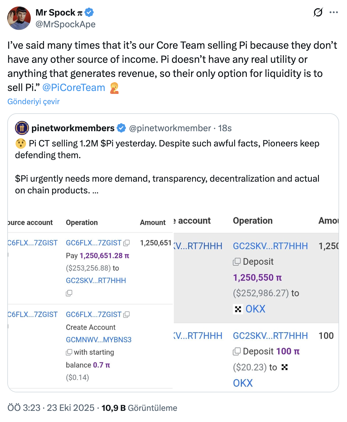 Known as a respected name in the Pi community, Mr. Spock, from his X account in sharing pi coinHe claimed that the Pi Network core team was responsible for the sharp decline in the price of . The expert stated that since the project did not have an income-generating product or a strong ecosystem, the team sold its coins to create liquidity. Spock stated in his statement that the team’s only financial exit was to convert their PI assets into cash.