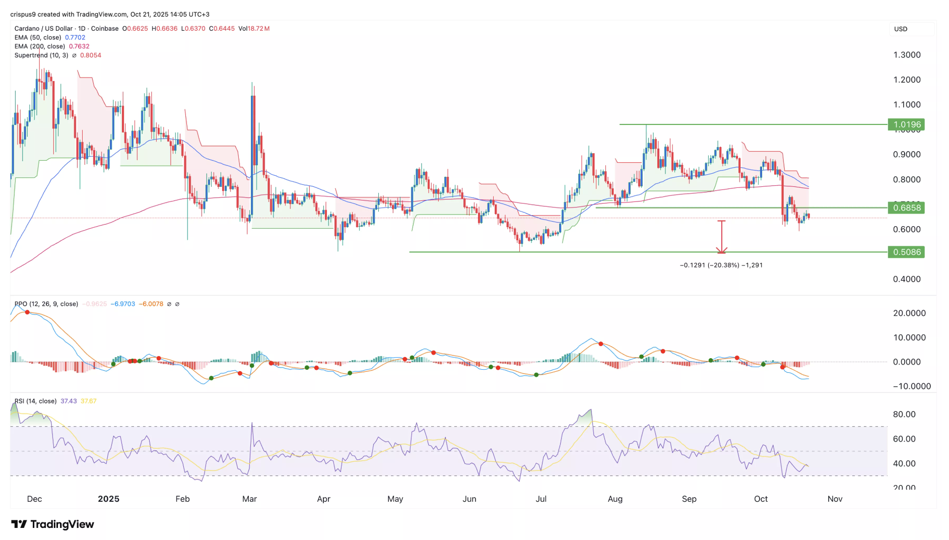 $0.652974As of October 25, it was trading at USD 0.6420, while technical indicators are signaling a decline of at least 20% soon. In addition, TVL (Total Locked Value) losses in the ecosystem and stagnation in transaction volume also make investors think. In light of these developments, ADA is among the criteria that investors should follow carefully.
