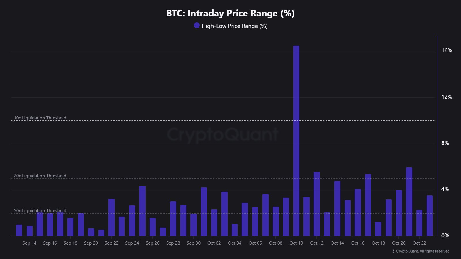 Inside blockchain analyst maartunnBitcoin has been moving in a narrow price range in recent days determined. According to CryptoQuant data, daily volatility decreased to 2 percent on October 21 and 3 percent on October 22. According to the analyst, this silence is the calm before the storm and indicates that we are on the verge of a typical squeeze and a major price movement.