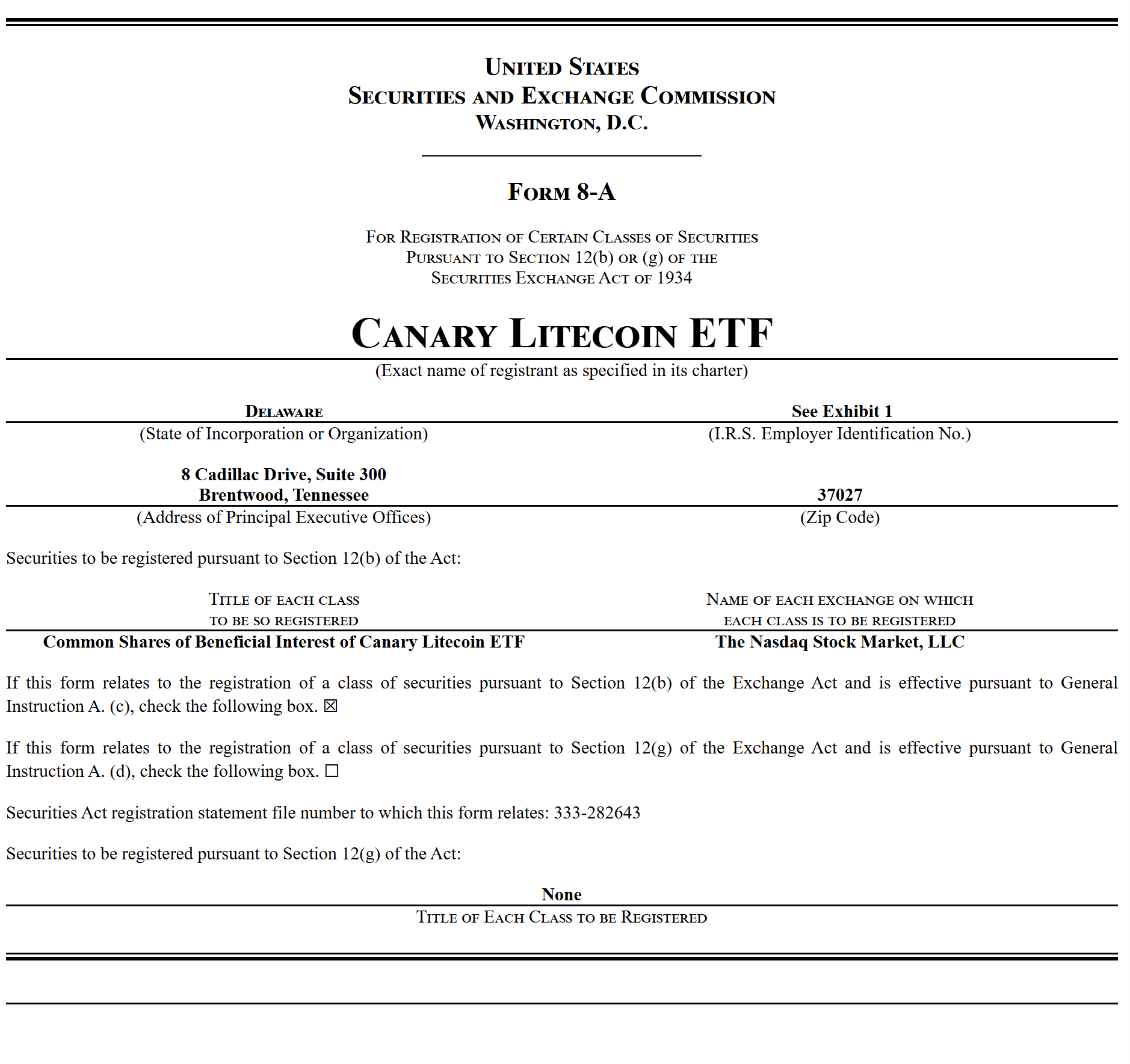 “Canary Capital has filed a form 8-A with the SEC to list the Canary Litecoin ETF on Nasdaq, indicating that the launch is imminent and trading may begin soon. (NASDAQ:LTCC)”