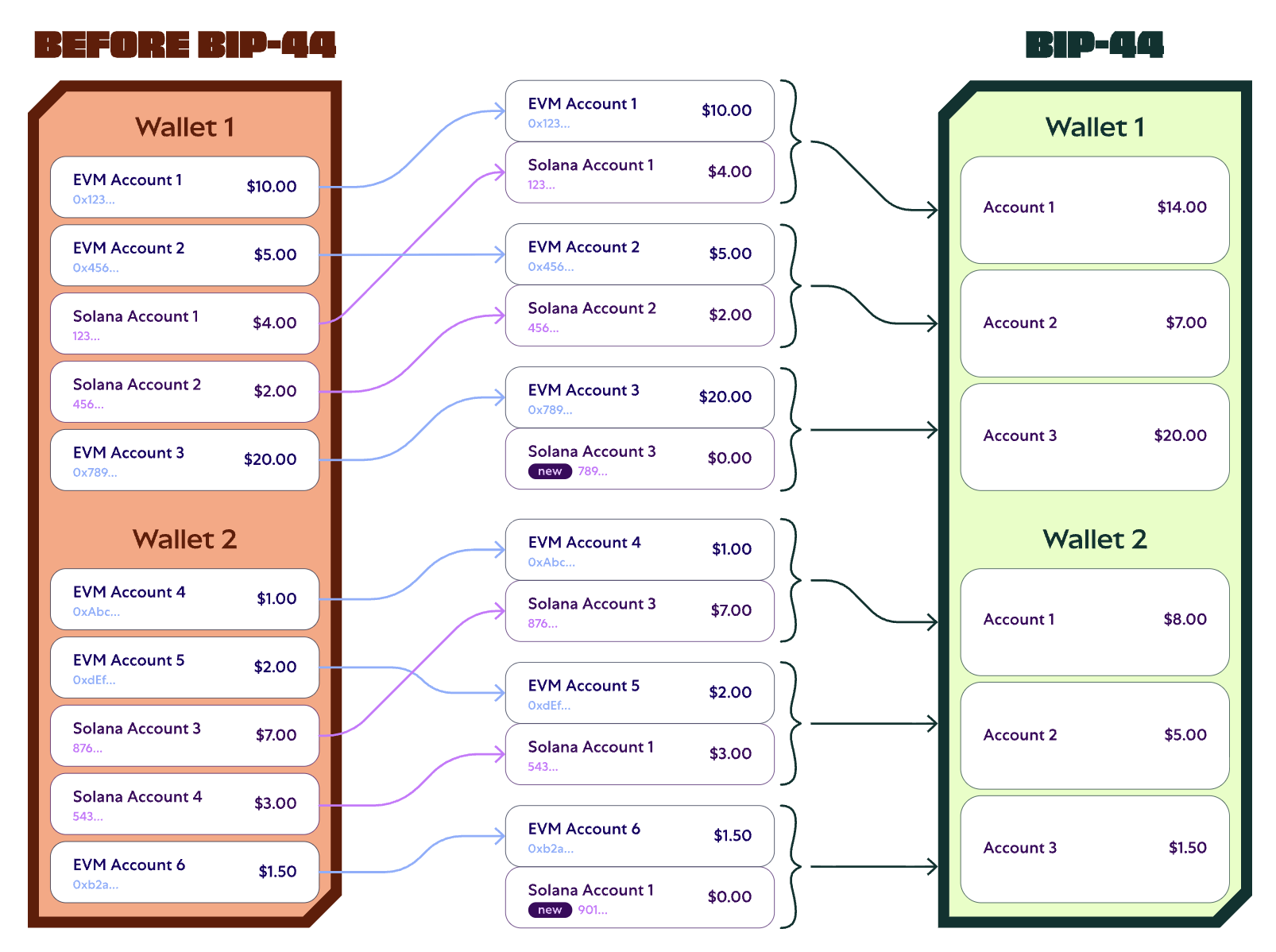 The new system is based on BIP-44 standards. This standard allows the organized creation of multiple accounts from a single recovery statement. For hardware wallets, Solana support has not been activated yet. These devices are limited to EVM networks only.