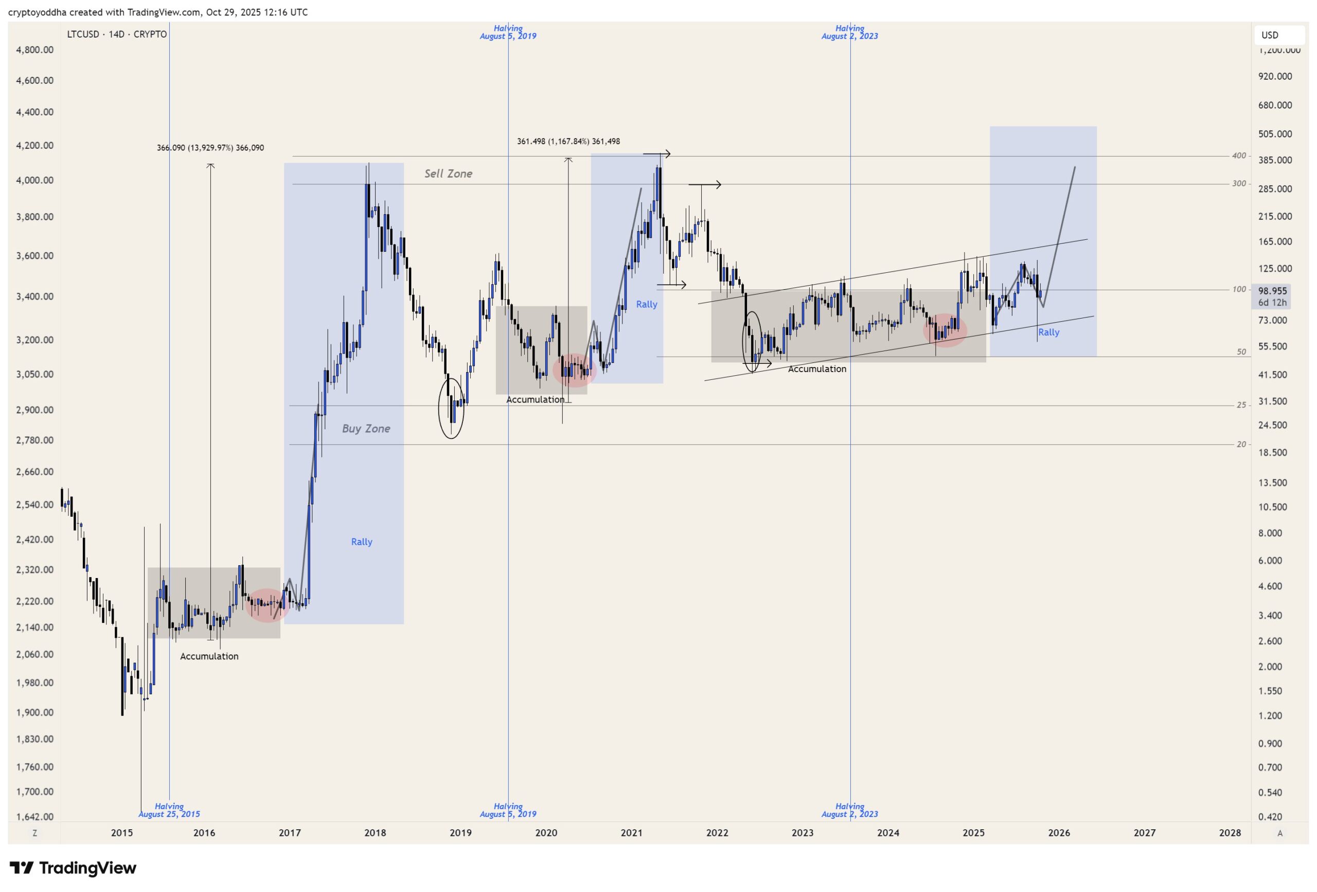 LTC It has a strong community and the accumulation has been extended with the halving. Although the rally period technically started, the price did not rise vertically as planned. Yoddha says what is missing here is the peak we need to see during the rally period and predicts a peak close to $400.