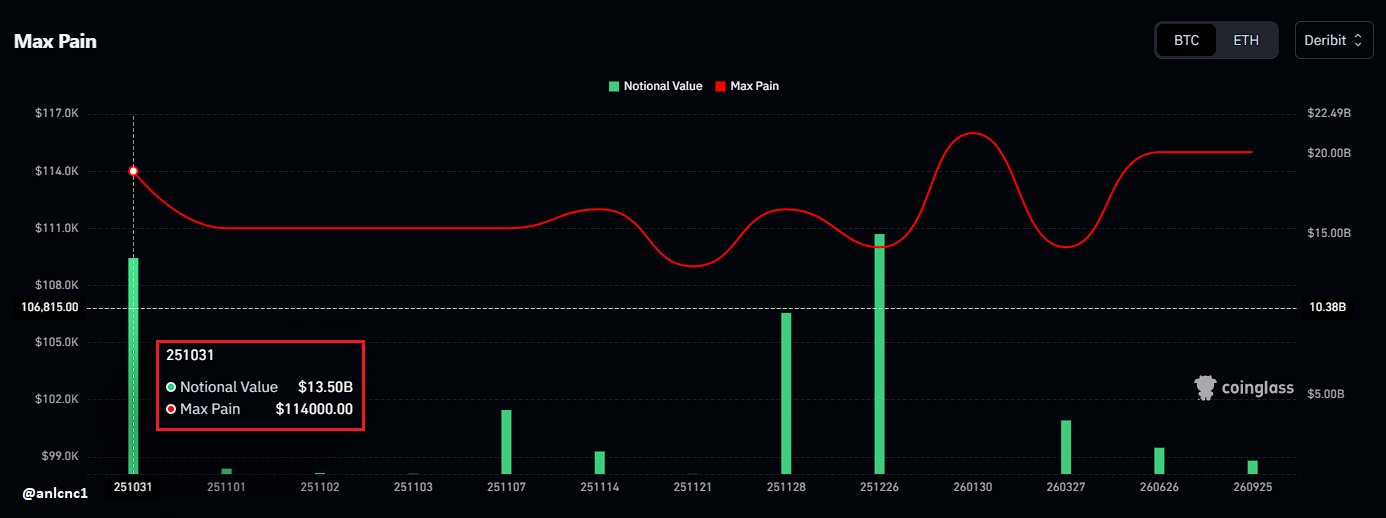 “Tomorrow morning at 11:00 (UTC), Bitcoin’s contract worth $13 billion will expire in the options on Deribit. The maximum pain level is $114,000. There is no certainty, it may just have a magnetic effect, if not, some people will be very hurt.”