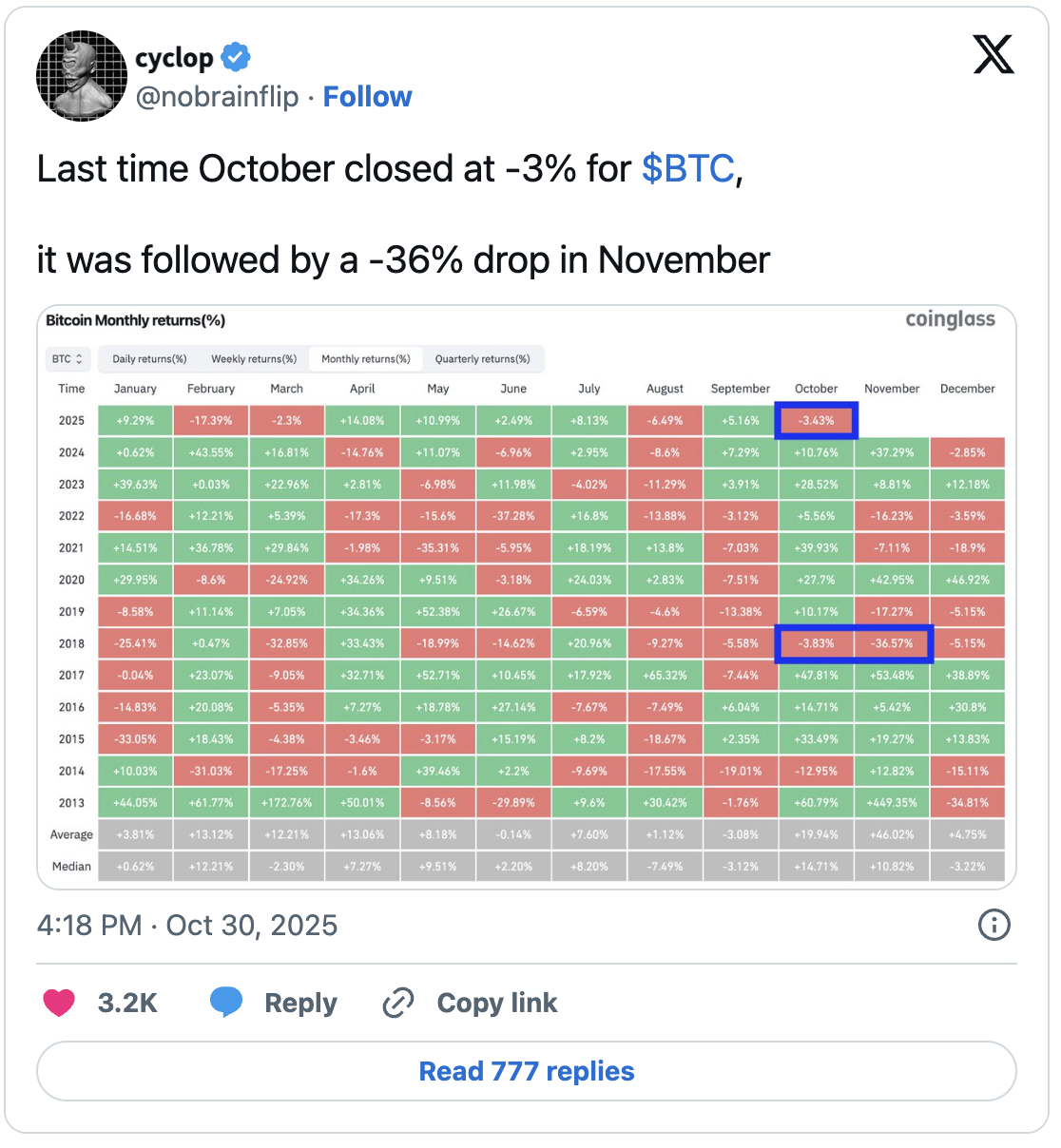 On October 10, there was a drop from $ 121,000 to $ 101,000 on some stock exchanges, and although there was a short recovery attempt, it fell again to $ 104,000 a week later. This decline process was considered “daunting” for the market. Although there were positive factors in the remaining days of October, such as low inflation data, the Federal Reserve’s approach to interest rate cuts, and promising trade news on the Washington-Beijing front, these factors failed to deliver as expected, and Bitcoin closed the month slightly red — in October, historically known as the “bull month”. This also ended Bitcoin’s six-year October green close streak.