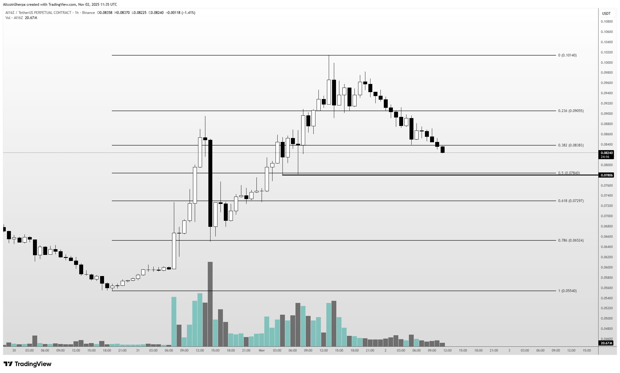 AI16Z If we look at (ai16z), Altcoin Sherpa pointed out the oddity in the chart. It’s absolutely picture-perfect and has been declining quite steadily. Sherpa wrote that the decline could be stopped at $0.077 and that he would consider it as support.