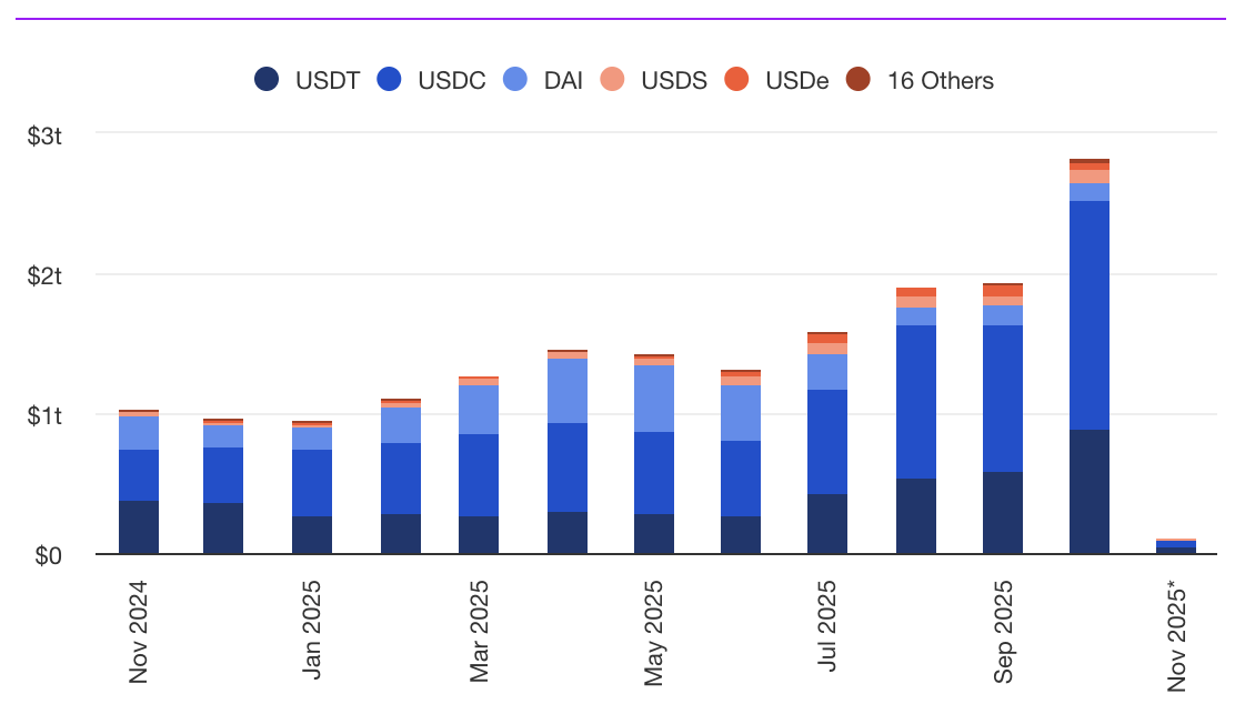 $3,890.97The transaction volume of stablecoins in October reached the highest level in history, reaching 2.82 trillion dollars. As the market slowed down and investors turned to return opportunities, the volume in Blockchain exceeded the previous month’s record by 45 percent, marking a new milestone.