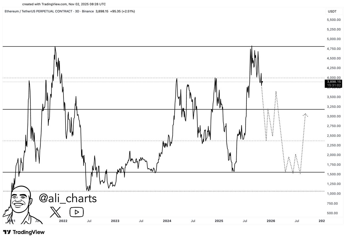 Ali Martinez ether We have just seen the worst case scenario for The analyst predicts a drop to $2,400 and $1,700 in an environment where the $3,800 support cannot be regained. The graph it follows is as follows.