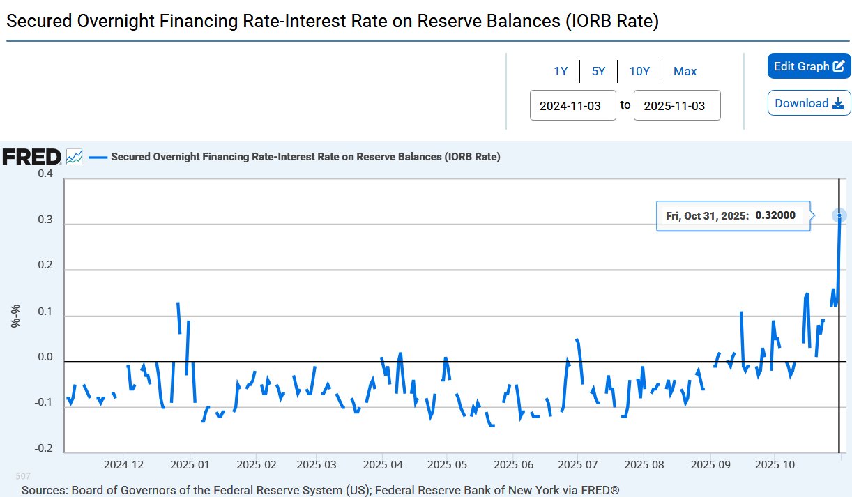 “The “Dollar repo rate” (SOFR), which has a daily transaction volume of $3.2 trillion, was 4.22% today. The interest paid by the Fed on idle reserves of $3 trillion (IORB) is 3.90%. That is, the margin of both increased to 32 basis points. This is perceived by the market as “fragile / dispersed liquidity” = funding risk.”