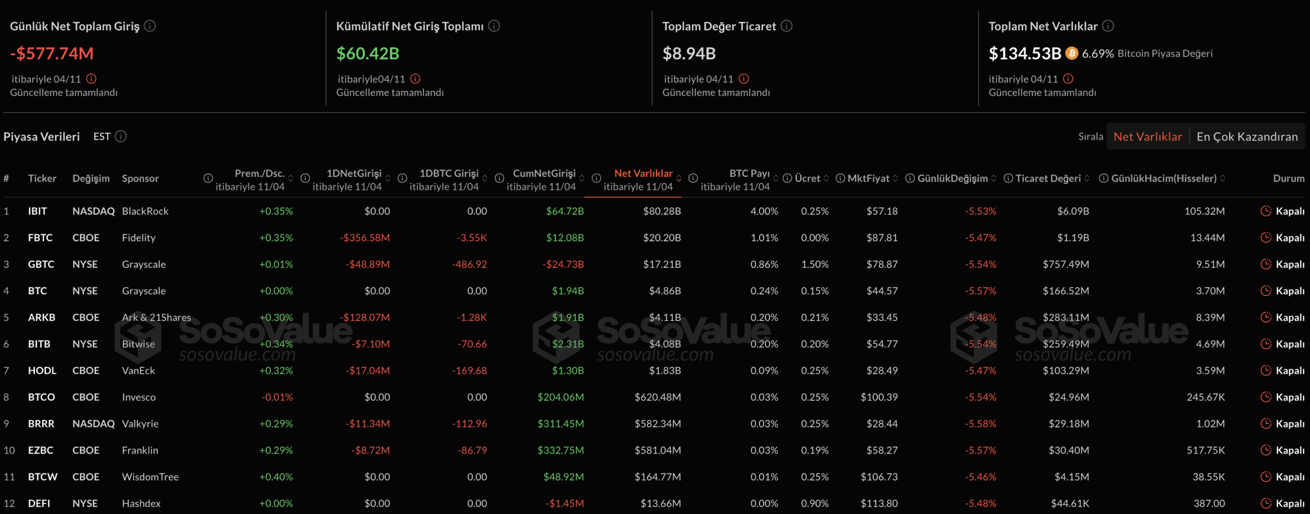 Spot traded in the USA Bitcoin $104,050.19 and Ethereum $3,494.70 There was a total net outflow of about $800 million from its ETFs on Tuesday. During the deepening selling wave in the markets, institutional investors repositioned their portfolios. SoSoValue According to the data, there was an outflow of $ 577.7 million only from spot Bitcoin ETFs, and this figure was recorded as the highest daily outflow since August 1. Fidelity$356.6 million from ‘s FBTC ETF, Ark & 21Shares$128 million from ‘s ARKB ETF, GrayscaleThere was an outflow of 48.9 million dollars in ‘s GBTC ETF.