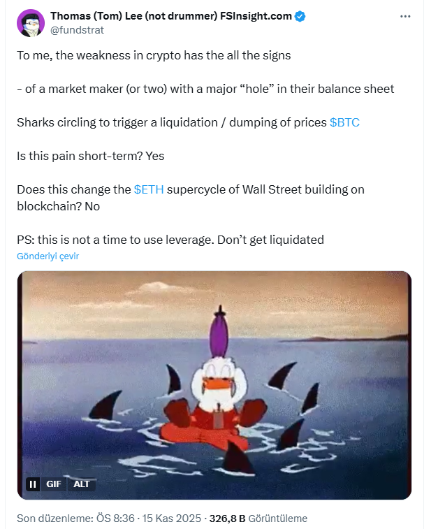 According to Tom Lee, the main reason for the decline in cryptocurrencies is the gap in the balance sheets of one or more market makers. Some whales (institutional competitors, etc.) who want to turn this into an opportunity are trying to reduce BTC to trigger liquidation. Lee thinks this is a short-term problem.