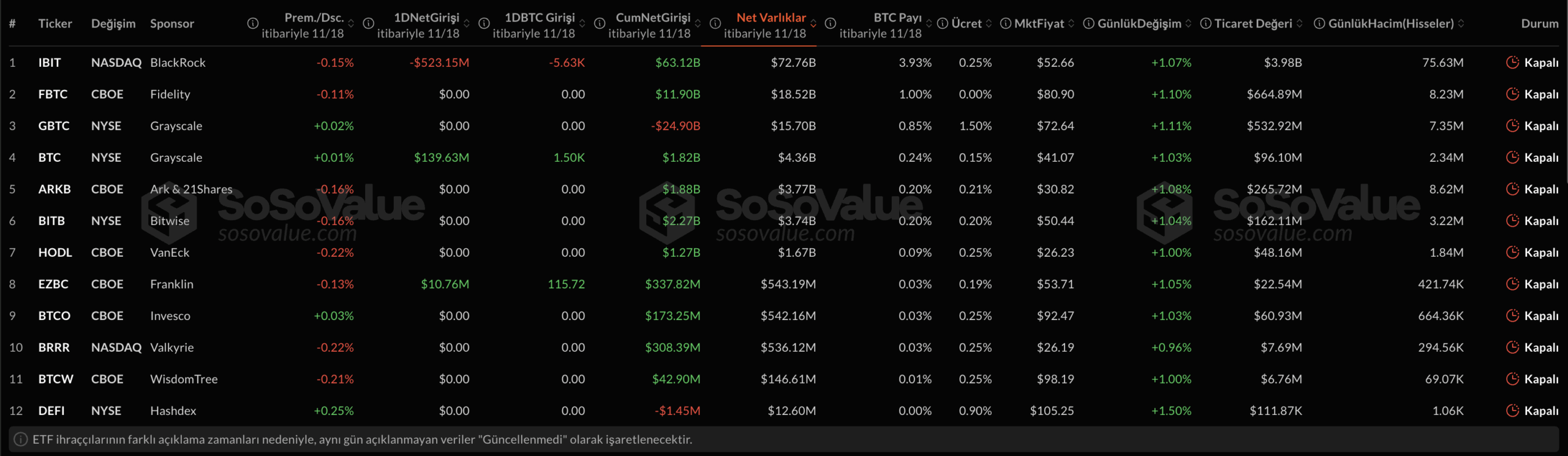 BlackRock‘s IBIT fund suffered its biggest daily loss since its launch in January 2024, with a net outflow of $523.2 million recorded on Tuesday. Seeing a net outflow on the fifth trading day throughout November shows that investors are cautious against high volatility. Franklin Templeton‘s EZBC fund is $10.8 million, Grayscale‘s Bitcoin Mini Trust attracted $139.6 million in inflows, while there was a total net outflow of $372.8 million from spot Bitcoin ETFs.