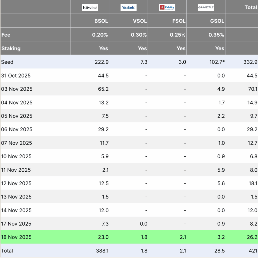 Investment demand for Solana ETFs remains strong despite the price decline. Total net inflows into ETFs on November 18 rose to $26.2 million. Bitwise’s BSOL ETF came out ahead with $23 million in flows, thus Solana ETFPositive inflows were recorded for the 15th consecutive trading day.