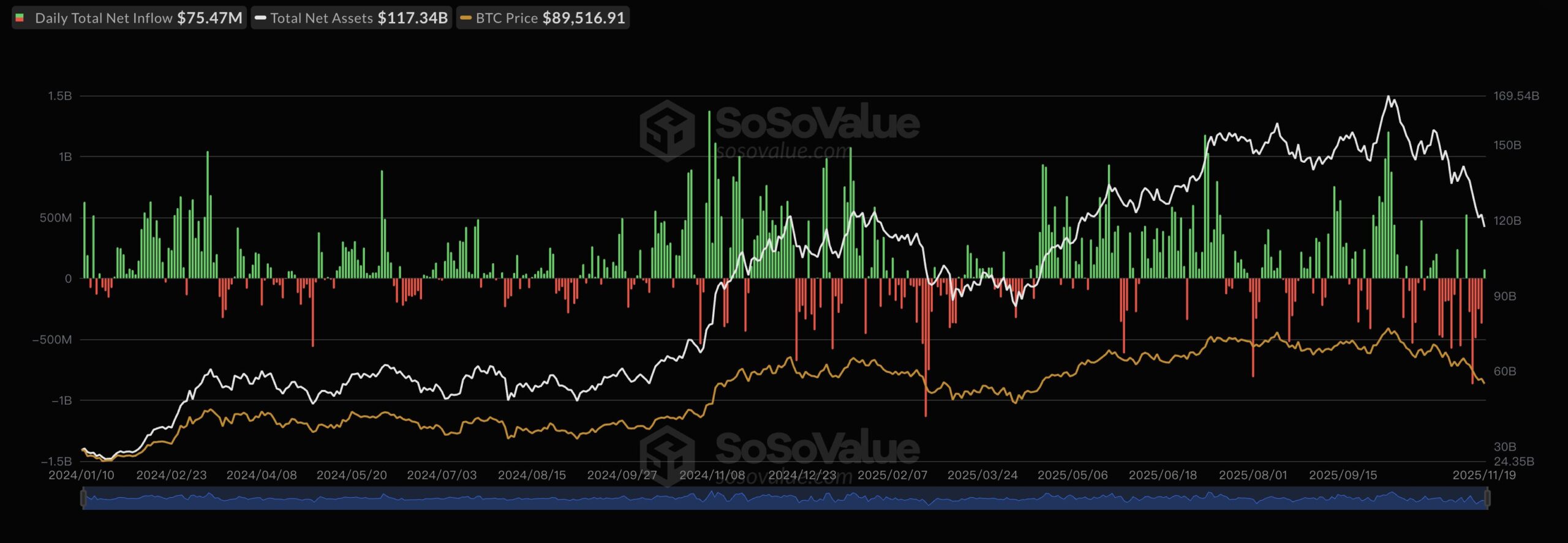 traded in the USA spot Bitcoin ETF‘s attracted attention with the strong capital inflow again as of November 19th. SoSoValue According to data, the total net inflow was $ 75.47 million, while most of this amount came from BlackRock’s iShares Bitcoin Trust (IBIT) fund. There was an investment inflow of $60.61 million in IBIT alone. With this picture, it would not be wrong to say that investor interest has turned to Bitcoin again after the weak ETF performance in recent weeks.
