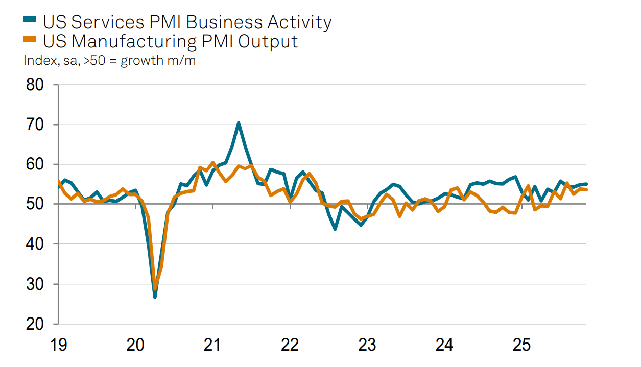 “For now, this upturn appears to be encouragingly broad-based, with production rising in manufacturing and the broad services economy. A marked increase in business confidence about the prospects for next year adds to this good news. Hopes for further cuts in interest rates and an end to the government shutdown have boosted optimism, with economic optimism rising and concerns about the political environment easing. “However, manufacturers have reported a worrying combination of slowing growth of new orders and record increases in finished goods inventories. The accumulation of unsold inventories indicates that factory production will grow more slowly in the coming months unless demand revives, which could lead to slowing growth in many service sectors. “Also, although jobs continued to be created in November, the employment rate continues to be constrained by cost concerns associated with tariffs. Both input costs and sales prices rose at increasing rates in November, which will be a cause for concern for inflation hawks.”