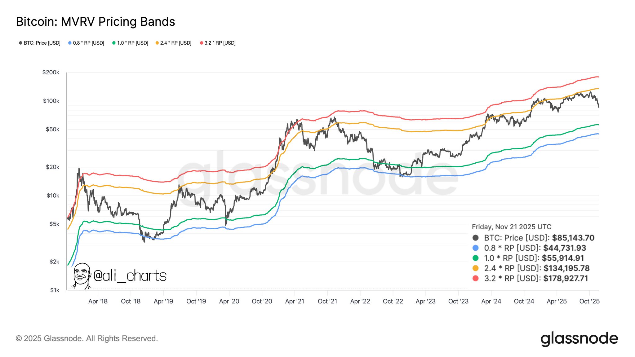 cryptocurrency analyst Ali MartinezConsidering Bitcoin’s historical lows relative to its price bands, it indicates the potential for a deeper decline. does. According to Martinez, Bitcoin has formed a bottom in the green and blue band range in the past, and if this scenario repeats, the price could drop to $44,700. Reaching this level would mean an additional loss of approximately 50 percent from current prices.