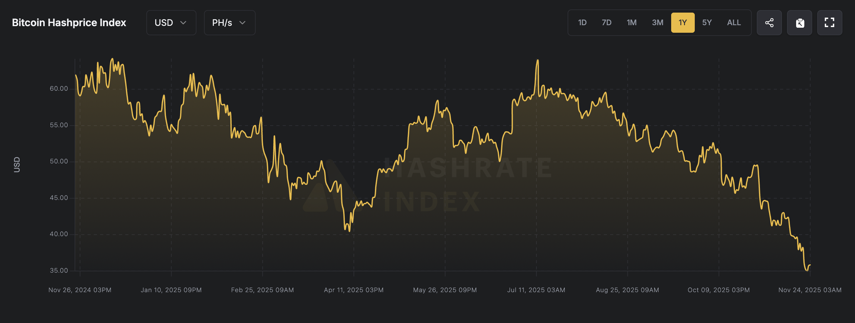 Luxor Showing the income miners earn per unit hash power according to data Bitcoin hashprice The indicator dropped to an all-time low of $34.2/PetaHash. The 30 percent drop in Bitcoin’s price, low transaction fees and high network difficulty continue to keep revenues under pressure. While the network’s hash rate remains at one zettahash level, the difficulty adjustment expected next week is predicted to bring a decrease of around 2 percent.