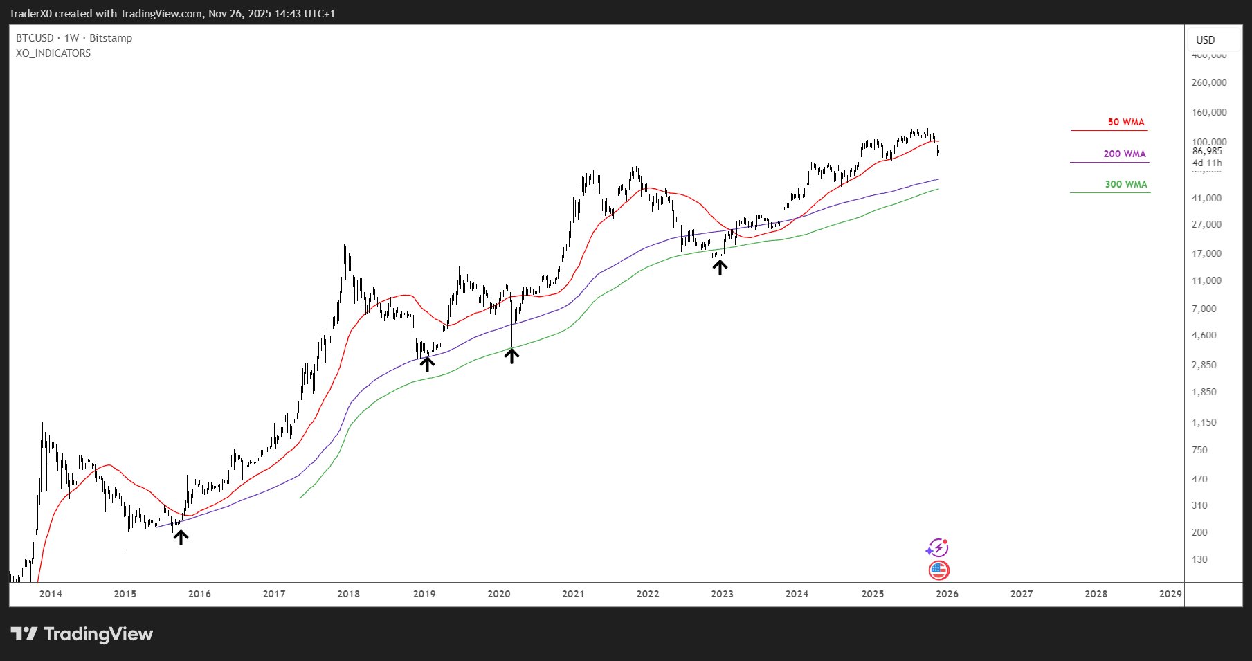 “The price has only fallen below the 300-week MA once in its history, and moves below the 200MA have been short-lived for most of the cycle lows. If we return to these levels and the overall market context is favorable, I would view this area as a high-probability buying opportunity…
