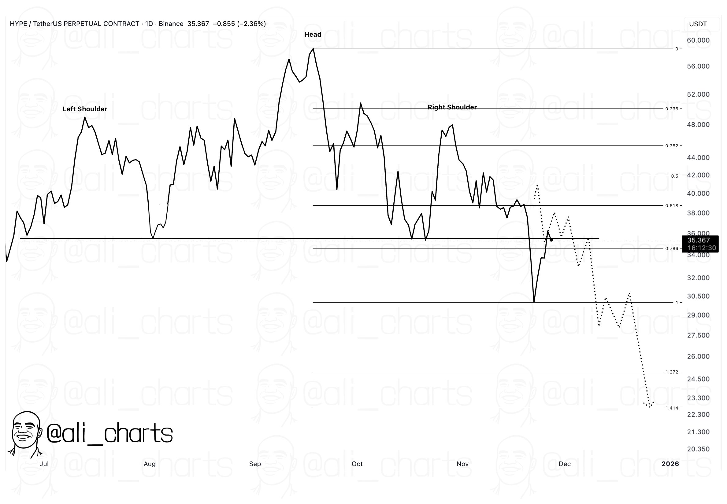 The target is a drop to $25 and depending on the reaction from there, the targets on the chart may be tested.