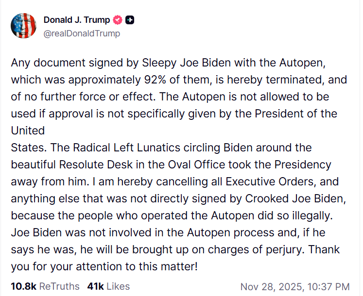 The Radical Left Crazies who surrounded Biden around the beautiful Resolute Desk in the Oval Office took the presidency from him. Because the people using Autopen are doing so illegally, I am rescinding all Executive Orders and anything else not directly signed by Crooked Joe Biden. Joe Biden was not involved in the Autopen process, and if he says he was involved, he will be prosecuted for perjury. Thank you for your interest in this matter!”