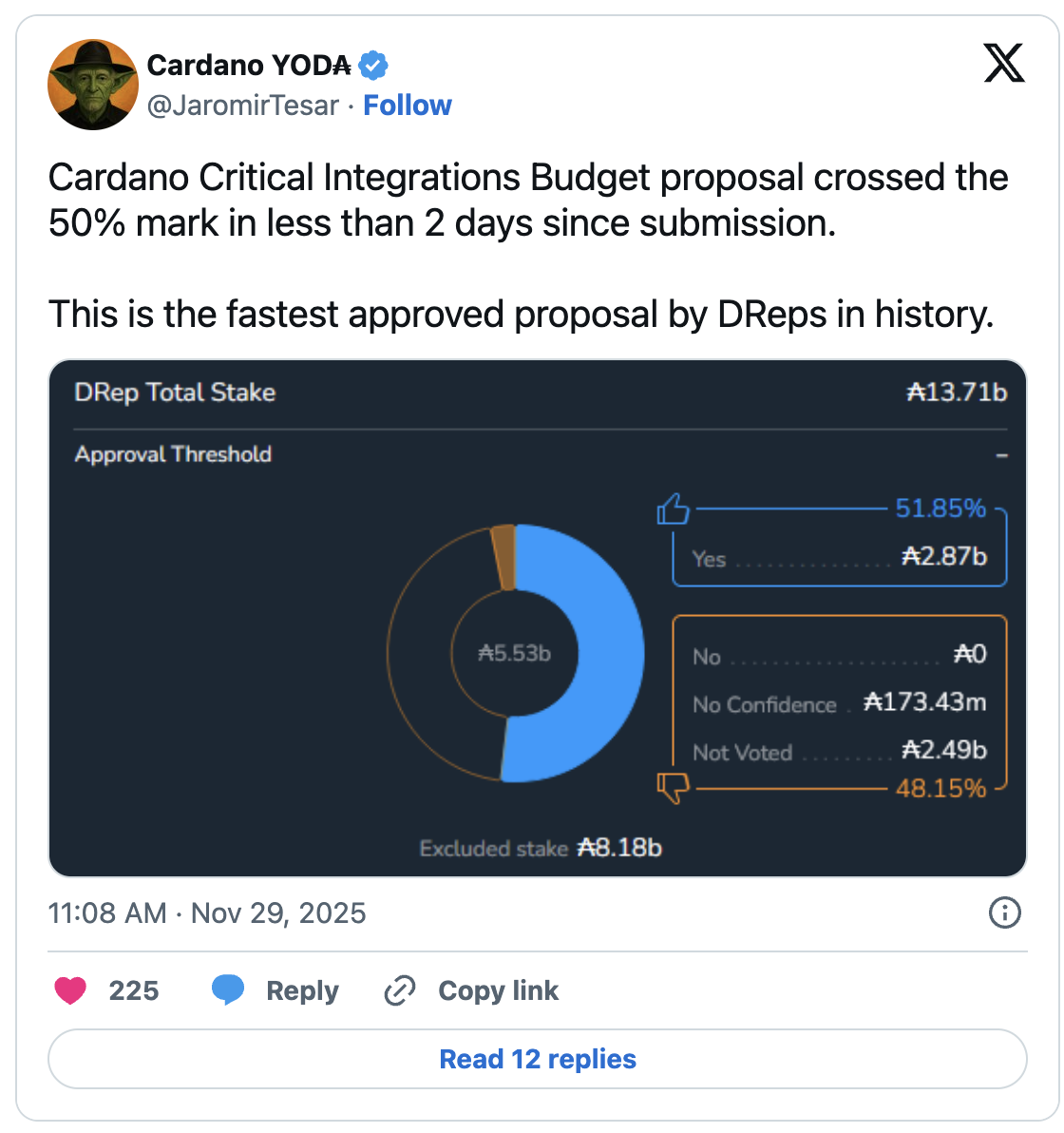$0.417917 ecosystem has passed another important threshold in terms of decentralized governance model. For the first time in Cardano history, a budget proposal submitted by DReps broke the record by surpassing the 50 percent approval threshold in just under two days. This proposal, called “Cardano Critical Integrations Budget”, envisages allocating 70 million ADA from the treasury fund for critical integrations of the ecosystem. This development reveals both the maturity of Cardano’s governance structure and the speed of the community’s decision-making processes.