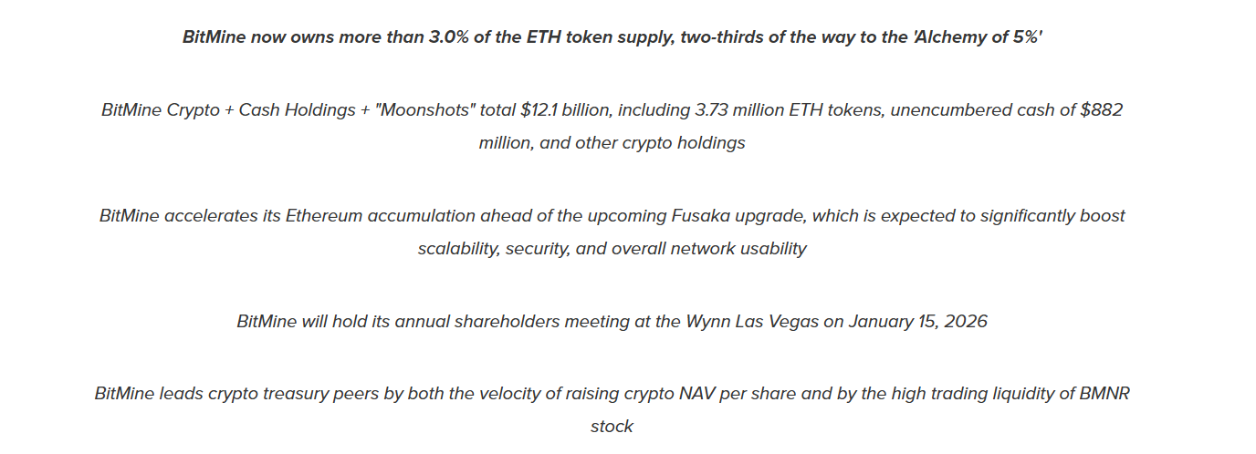 The company started saving in June and rapidly increased its reserves. ETH The company, which alone holds more than 3% of its supply as of today, is one step closer to its 5% target. BitMine officials announced that two-thirds of its target has been achieved. Crypto + Cash Assets + “Moonshots” gave the good news that they have reached a total reserve size of 12.1 billion dollars.