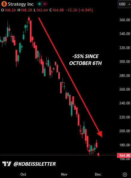 MicroStrategy It fell over 7% today, falling to its lowest level since October 2024. The stock has lost 55% of its value since October 6, one of the sharpest declines in its history. After exceeding the peak of the dot-com bubble, it was very meaningful for MSTR to experience a decline reminiscent of the dot-com bubble period.