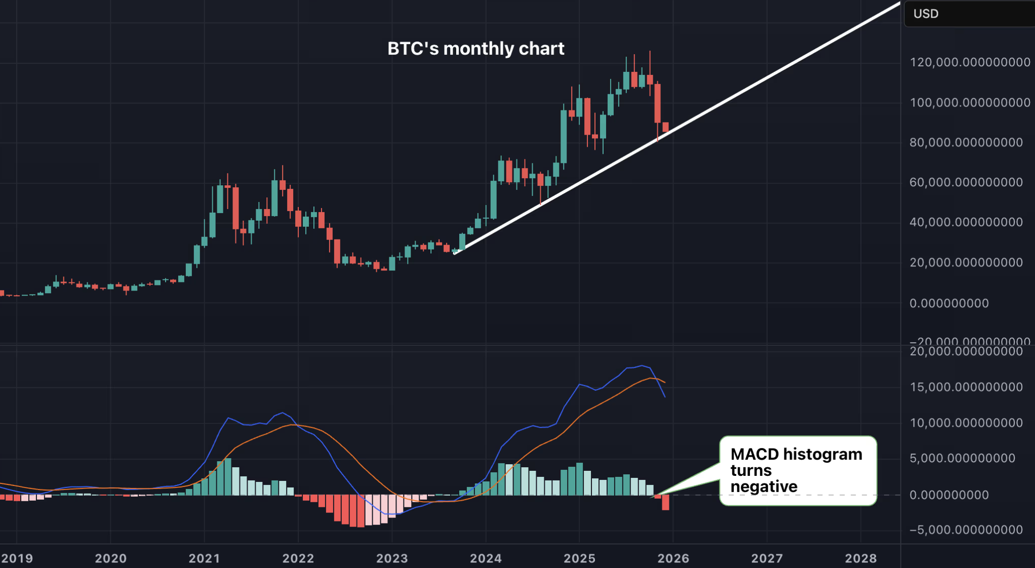 $86,219.53monthly, which is one of the long-term technical indicators of MACD Histogram turned red in November. Similar signals from the indicator have been seen at the beginning of every major bear market since 2012. As the price dropped over 17 percent in November, the indicator fell below the zero line, confirming that the uptrend had been replaced by a downtrend.