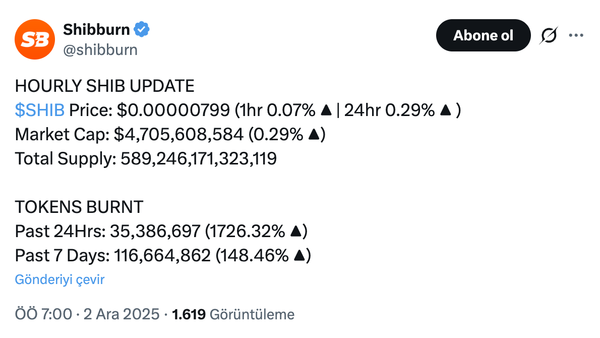 According to Shibburn data, over 35 million SHIBs have been permanently removed from circulation in the last 24 hours alone. With a total of 35,386,697 SHIBs burned, the daily burn rate increased by more than 1,726%. It is stated that on a weekly basis, 116.6 million SHIB was sent to “dead wallets” and the weekly burn rate increased by more than 148%. This development reduced the total SHIB supply to 589.24 trillion.