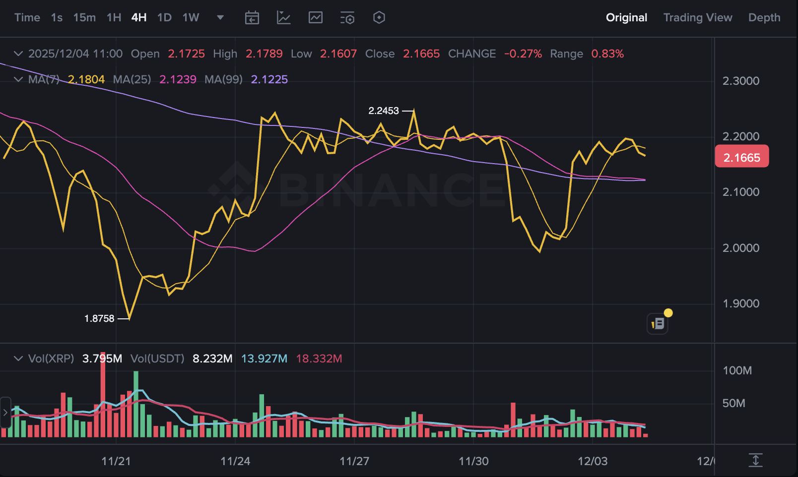 On the daily chart, XRP is stuck inside a clear downward channel. The overall momentum is still considered negative as the price is trending below the 50, 100, and 200-day moving averages. Although it is close to the 20-day average price level, it has not yet signaled an upward turn.