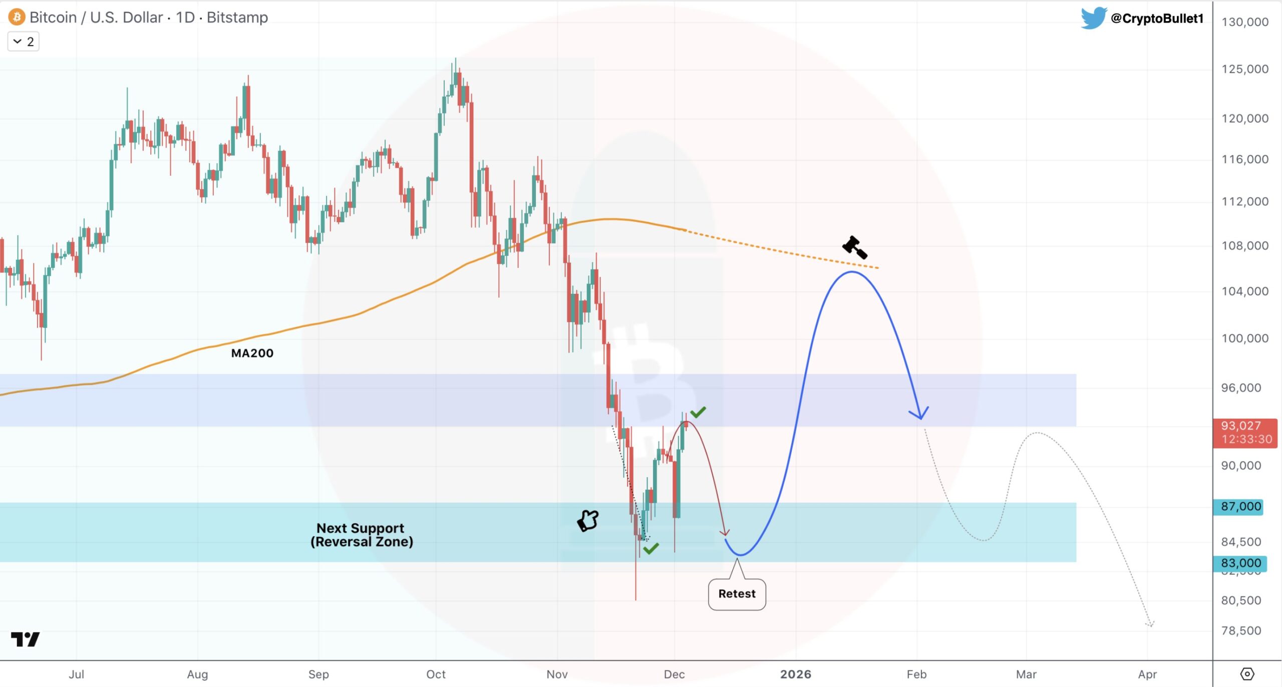 Roman Trading and many analysts maintaining bearish psychology BTC price It is waiting for the ongoing consolidation process to end. The bounce from the bottom may continue up to $104,000, but what they predict is that the decline will not stop until the new annual bottom. CryptoBullet shared the chart below a few hours ago and wrote that we will see a new test to $ 85 thousand and then a reaction rise to $ 104 thousand. His ultimate goal, too, is a deeper bottom.