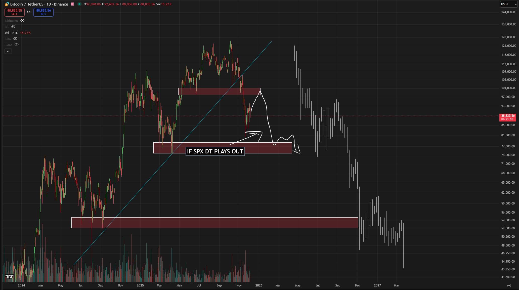 In today’s evaluation of Bitcoin He wrote that it would fall below 76 thousand dollars. This thesis is supported by the SPX chart (below).