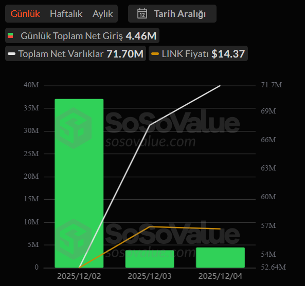 We need to open a separate topic for this because LINK Coin It launched an ETF that could be a signal of opportunity. This is exactly why we mentioned that I would be watching to see if ETF inflows remain strong even in an environment of fear. According to Sosovalue data, the first day’s $37 million entry was not continued. On December 3, there was an inflow of 3.84 million dollars, and on Thursday there was an inflow of 4.46 million dollars.